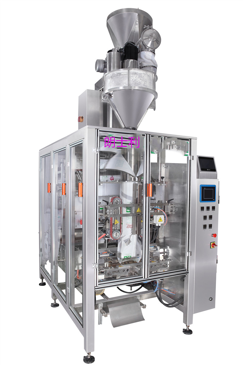 全自動面粉包裝機集制袋、充填、封口、打印、沖孔、計數于一休,采用雙伺服拉膜系統,送膜穩定、可靠、準確,邊封為獨立機構,有自動糾偏功能,保證了邊封的效果及穩定性,橫封采用伺服電機驅動,速度快,噪音低。本機所有功能都由PLC(可編程控制器)控制,PLC控制元件均采用國際名牌產品,性能可靠,操作人員可以在觸摸屏上控制所有必須的參數,使操作簡單,快捷。