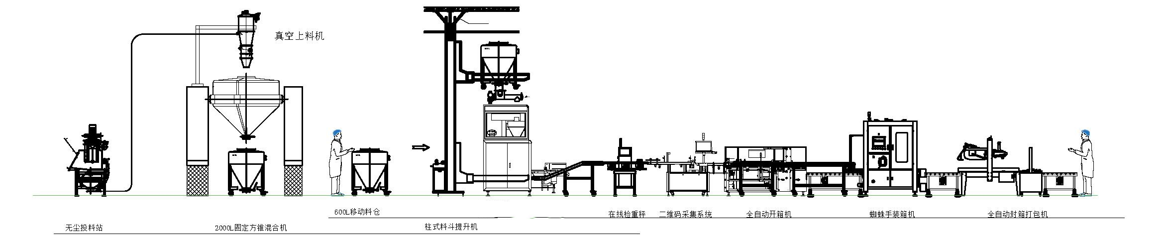 自動破包機投料(可選人工投料)-自動電腦配料-自動混合-自動放料至周轉斗-自動包裝-重量復檢-二維碼系統-蜘蛛手自動裝箱-自動開封箱系統-機器人碼垛-托盤庫系統